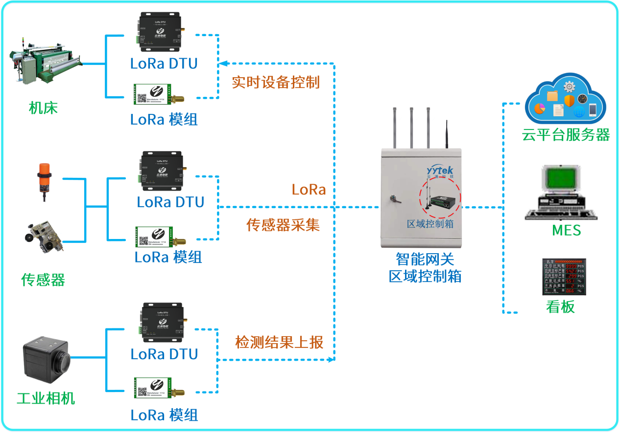 在工廠內(nèi)的各個終端節(jié)點(diǎn)(傳感器、工業(yè)設(shè)備、工業(yè)相機(jī))使用LORA DTU和LORA模組升級設(shè)備和傳感器,使設(shè)備具備無線傳輸能力,實(shí)現(xiàn)對生產(chǎn)數(shù)據(jù)的實(shí)時上報和操作指令接收。通過云涌智能無線網(wǎng)關(guān)對著這些終端節(jié)點(diǎn)進(jìn)行數(shù)據(jù)的采集和接收,再由網(wǎng)關(guān)進(jìn)行數(shù)據(jù)分析和協(xié)議轉(zhuǎn)換,與上層的不同業(yè)務(wù)系統(tǒng)進(jìn)行數(shù)據(jù)的交互。