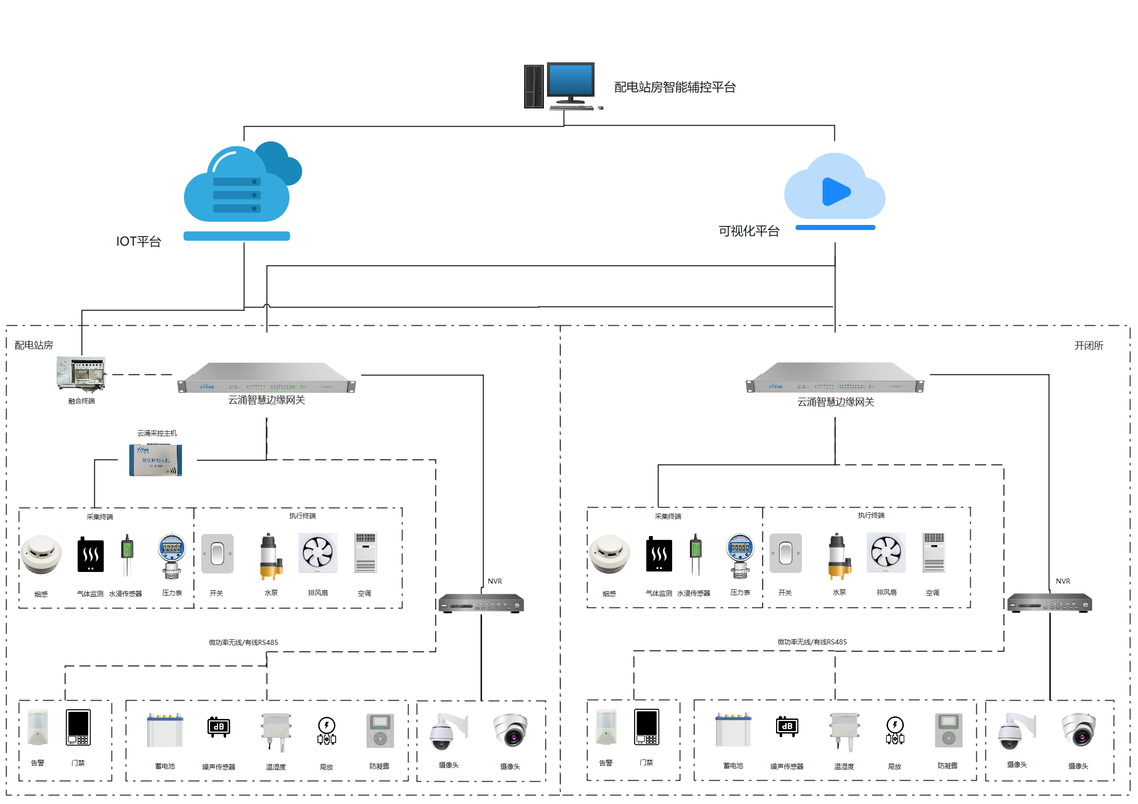 云涌智慧邊緣物聯(lián)網(wǎng)關(guān)是整個(gè)系統(tǒng)的中樞部分,不僅可以在站內(nèi)進(jìn)行實(shí)時(shí)數(shù)據(jù)的采集上傳,還能通過連接采控主機(jī),實(shí)時(shí)接收站房環(huán)境的數(shù)據(jù)信息,同時(shí)對于接收到的設(shè)備狀態(tài)、安防信息、視頻監(jiān)控等監(jiān)測數(shù)據(jù),及時(shí)上傳到IoT平臺和可視化平臺,最終對配電站房內(nèi)各功能模塊的信息進(jìn)行存儲、處理及分析,通過標(biāo)準(zhǔn)協(xié)議傳輸給配電站房輔助監(jiān)控平臺。此外,邊緣物聯(lián)網(wǎng)關(guān)還可以及時(shí)接收平臺發(fā)布的智慧控制調(diào)節(jié)命令,通過啟停相關(guān)設(shè)備來進(jìn)行環(huán)境調(diào)節(jié),并同時(shí)反饋執(zhí)行情況,設(shè)備傳感器實(shí)時(shí)采集信息反饋,平臺根據(jù)設(shè)備傳感器實(shí)時(shí)采集到的信息反饋,對調(diào)節(jié)結(jié)果進(jìn)行再判斷,可實(shí)現(xiàn)不斷循環(huán)優(yōu)化。