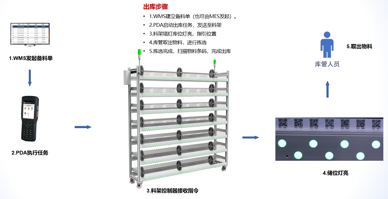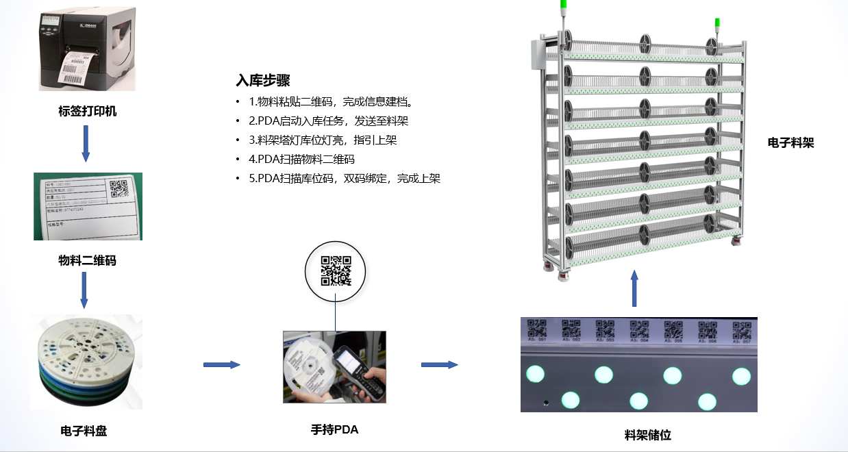 ? ? ? 對(duì)于SMT原材料使用電子料盤(pán)為存放單元,使用智能電子料架作為存儲(chǔ)設(shè)備。