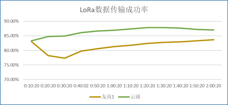 ? ? ? 在測試環(huán)境穩(wěn)定且一致的條件下,通過同樣的連接方式,對比云涌LORA數(shù)傳電臺和另外兩家友商設(shè)備的測試結(jié)果,可以得出:云涌科技的LoRa DTU擁有更好的抗干擾能力,而且在同頻干擾的情況下,傳輸?shù)某晒β矢?,傳輸?shù)姆€(wěn)定性更好。